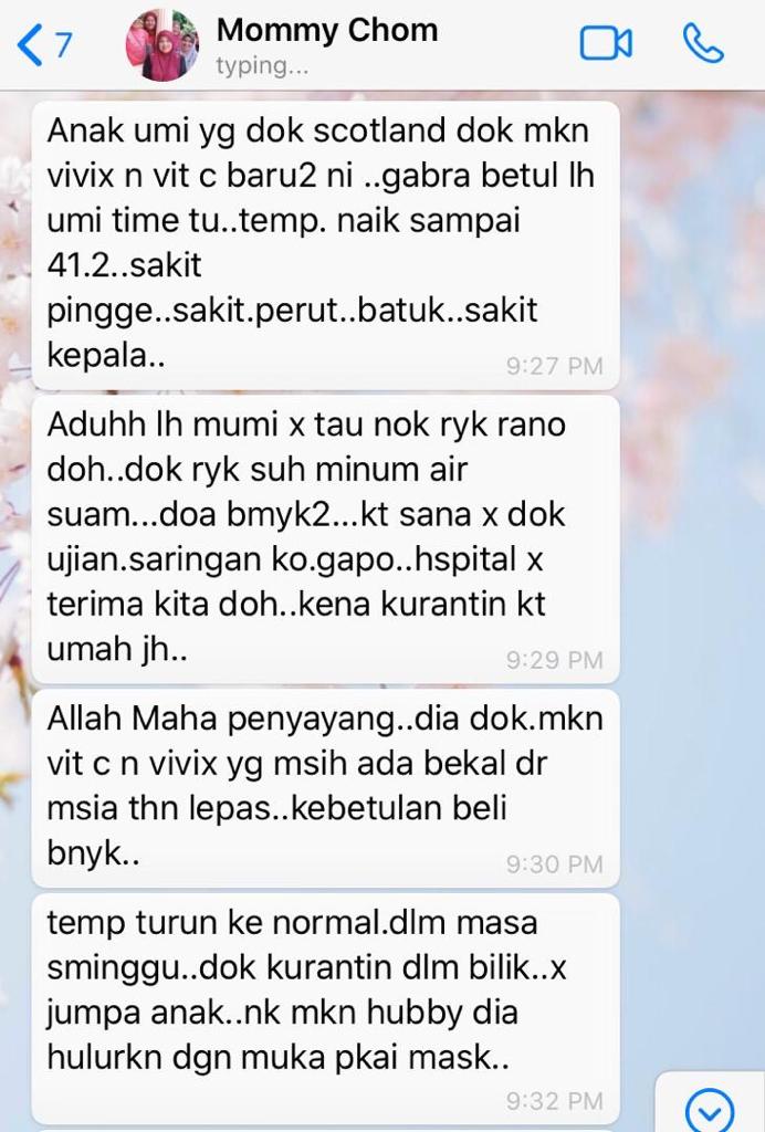 Sebuah perkongsian oleh “Mommy Chom” (dikongsikan oleh Kak Wawa pada April 2020) menceritakan pengalaman cemas anak perempuannya yang berada di Scotland, terutamanya ketika dunia sedang dilanda pandemik Covid-19.